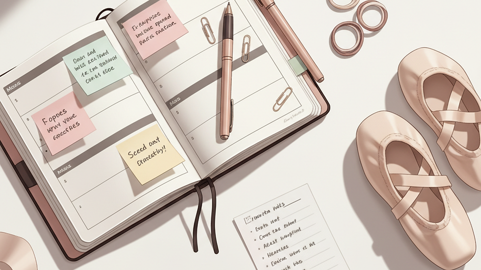 Pour vous aider, j'ai préparé une checklist simple et complète, conçue pour toutes les disciplines (classique, jazz, contemporain, hip-hop, etc.) et tous les âges (enfants, adolescents, adultes). L'idée est très pratique : vous la passez en revue une fois 28/21 jours avant l'événement, puis une seconde fois 14 jours avant, et vous évitez 90 % des oublis.