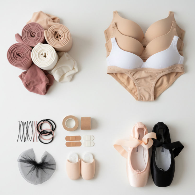 Danse classique : collants + chaussons/demi-pointes (et pointes si concerné), accessoires cheveux souvent plus stricts